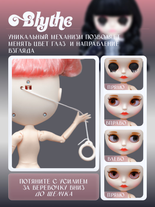 глазной механизм: 4 цвета глаз, смена цвета и направления взгляда с помощью верёвочки на затылке.