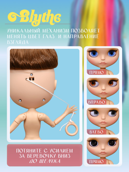 глазной механизм: 4 цвета глаз, смена цвета и направления взгляда с помощью верёвочки на затылке.